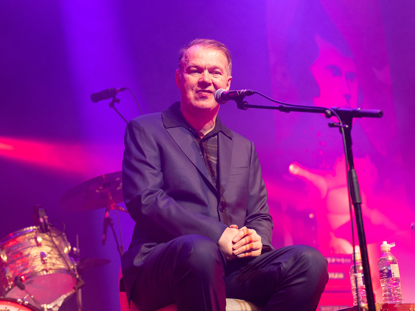 The buzz of expectant chatter in the auditorium turns to cheers as the room fills with the magnificent racket of The Mekons’ 1978 single, “Where Were You”, clattering out as intro music, and as a reminder of what was in the air back when all this started. Behind the stage, letters apparently stolen from the set of Elvis’s 1968 comeback special spell out E D W Y N. And now Edwyn Collins himself appears from the wings, walks slowly and determinedly to take the chair he will occupy for most, but not all, of the evening, and leans toward the mic.