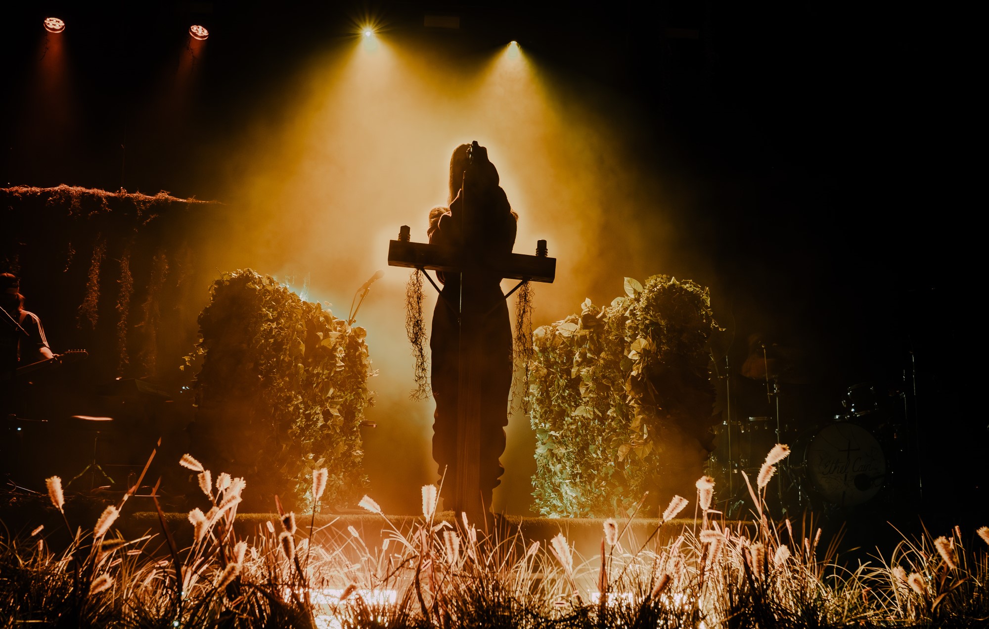 NME attended her recent show in London’s Hammersmith Apollo, and in a four-star review wrote: “Anhedönia conjures the slightly campy, vaguely spooky atmosphere of a B-movie graveyard, and performs the majority of the show from within her mossy altar, which comes complete with theatrical backlighting and a crucifix mic stand. A show exceedingly light on stage patter, the few words she does exchange with the crowd are unshowy, and more or less invisible to most of the room.”