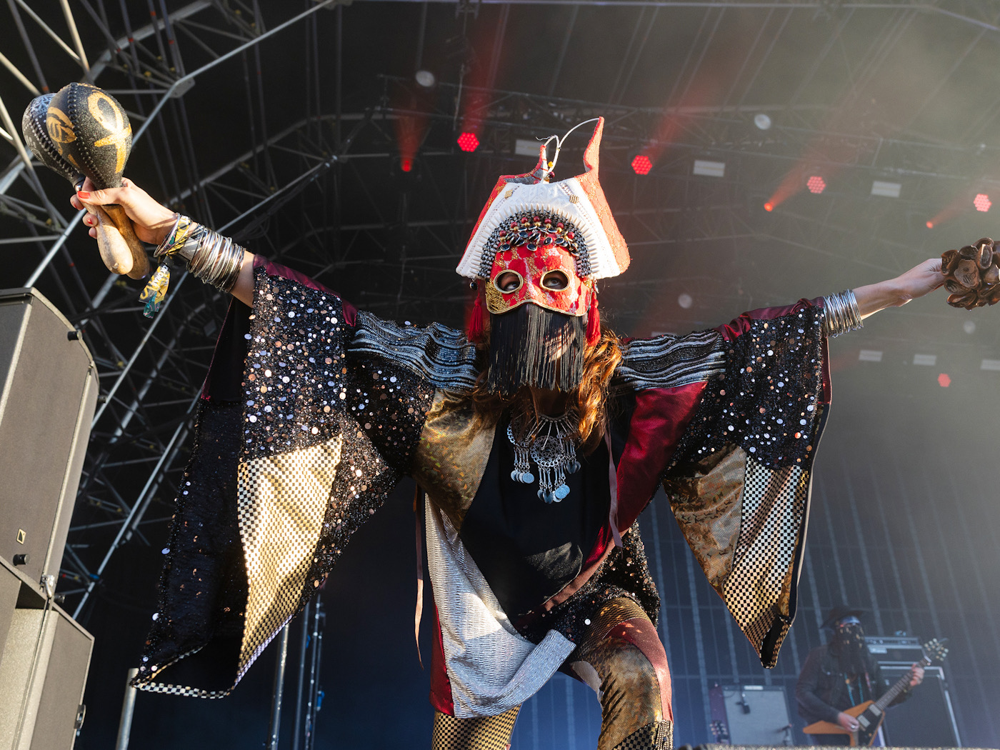 Jackie-O Motherfucker’s slowly undulating oddness is diverting enough, but over on the main stage, Goat use roughly the same source materials to ignite a wild psychedelic dance party. More than a decade in, their refusal to show their faces feels less like a gimmick and more an attempt to focus on the stuff that really matters, at least at a festival: fuzz guitar freakouts allied to irresistible Afrobeat rhythms and raucous vocal incantations. Masked and behatted, the blokes in the band resemble the inept terrorists of a tiny mountainous enclave, while the twin female vocalists / percussionists / dancers / flautists are more like ancient Aztec deities running riot at an electroclash revival night.